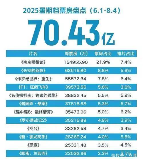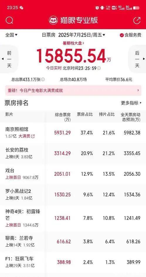 《戏台》和《南京影相馆》上映本日,两部电影之间的票房就出现了庞杂的差距。 《南京影相馆》首映本日就拿到了1.55亿,不雅影东说念主次达到了386万,况且票房涨势迅猛,在7月26日晚上8:35,单日的票房就照旧打破了2.58亿元。 戒指到8月4日,《南京影相馆》的票房照旧累计达到15.49亿元,凭证相干媒体的瞻望,这部电影的预期票房不错达到30亿足下。