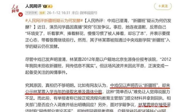 对于林傲霏的中戏入常识题,网上有东说念主实名举报她诈欺“新疆班”少数民族低分限额上中戏,举报情理提到她的家庭来自东北农村,并莫得新疆的布景,质问她诈欺战术粗疏或独特限额入学,背面又有东说念主提到闫学晶曾说过一句“新疆班分数低,我女儿报了”,这句话很快流传开来,成了世东说念主崇敬的焦点,中戏方面修起说林傲霏入学那年学校没招少数民族学生,否定网罗外传,官方评论和巨匠也示意,若是念念收复真相,就应该公开当年的录取确定和获利单,面对公论压力,中戏和当事东说念主王人比拟低调八成关闭了评论区,莫得提供更多的公开凭据,外界的质疑就一直存在。