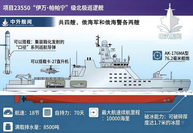 23550型极地破冰查察舰是俄罗斯有益为北极常态化军事存在量身定制的新一代武装破冰平台。该舰长114米,宽18米,吃水约6米,满载排水量达到8500吨至9000吨操纵,因想象先进、成就平衡,兵器鼓胀,被俄媒称为“北极海上霸主”。
