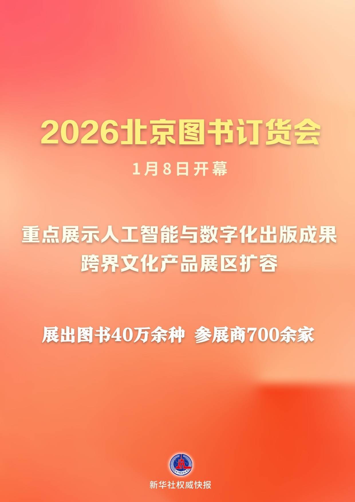 聚焦“谋新篇 开新局 启新程,续写出书刊行业新光芒”主题,2026北京史籍订货会1月8日在京拉开帷幕。本届订货会展览面积5万闲居米,展出史籍40万余种,参展商700余家,展台数目2700余个。跨界文化家具展区展位101个,比上届增多了1/3。