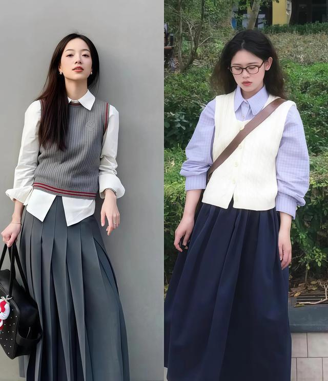 tips3:芳华学院风=马甲+衬衫+百褶裙