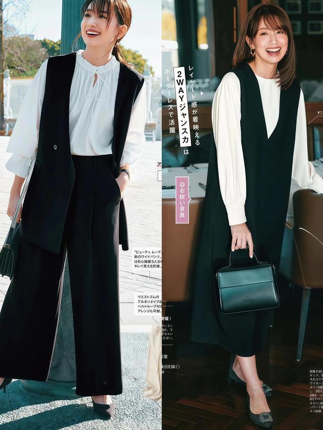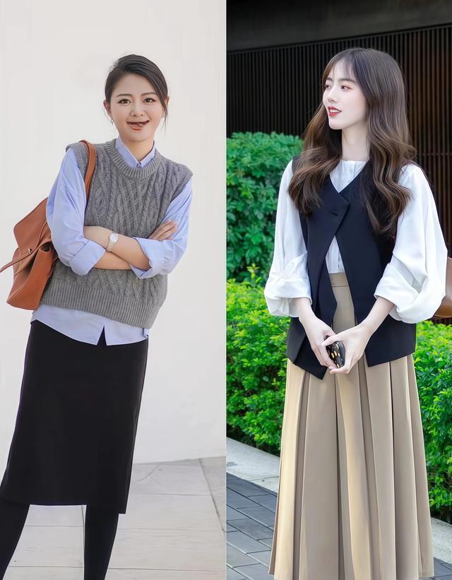 想穿出知性千里稳的气质,就换直筒毛呢裙作念下装,裙子挺括的面料,和马甲的立体剪裁放沿途很合拍,配心理干净的衬衫作念内搭,30+的女生穿这个搭配公式,刚好合适。