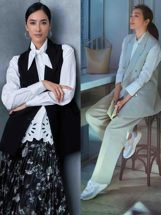 如果你合计,上班穿成套的西装太正经,那你不妨把西装外衣换成马甲试试,上身马甲加白衬衫搭九分西装裤,利落干练但比尺度工作装多了几分松驰,通勤穿偶然合适。